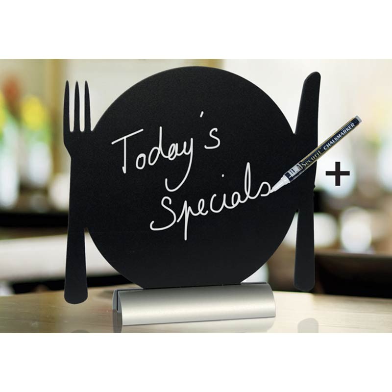 Originale et fonctionnelle, cette ardoise de table en forme d’assiette est idéale pour les restaurants, brasseries, cafés ou hôtels. Elle attire l'œil tout en restant sobre et raffinée. Grâce à sa double face et à son socle stable en aluminium, elle s’intègre facilement sur toutes les tables et comptoirs, pour afficher un plat du jour, une suggestion ou un message de bienvenue.
