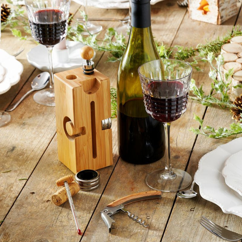 Chaque accessoire est conçu pour améliorer l’expérience de dégustation, que ce soit pour l’ouverture des bouteilles, le service ou la conservation du vin. Grâce à son bloc en bambou compact et esthétique, vous gardez tous vos accessoires à portée de main, parfaitement rangés et protégés.