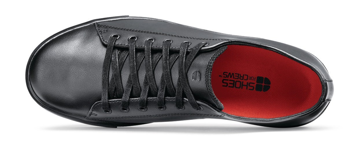 Shoes For Crews propose avec ce modèle Old School des chaussures à l'allure de tennis de ville. Les chaussures Old Shool sont un classique et un intemporel du dressing. La chaussure est en cuir, ce qui appuie l'aspect design et renforce sa qualité. L'intérieur de la chaussure est rouge, pour dénoter du noir.