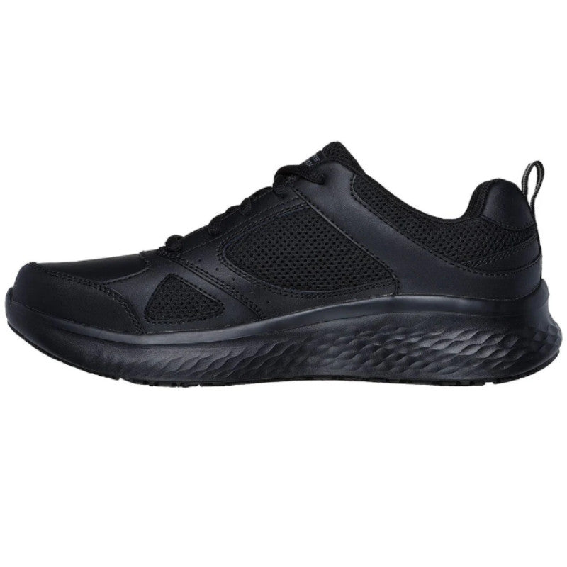 Le confort est renforcé par une semelle intérieure Skechers Air-Cooled Memory Foam®, qui épouse la forme du pied tout en permettant une bonne aération. La semelle intermédiaire Skech-Lite amortissante réduit les chocs, tandis que la semelle extérieure flexible et antidérapante offre une excellente adhérence sur sols humides ou glissants. Ce modèle est également certifié pour les risques électriques (EH – ASTM-F2892), un vrai plus pour les environnements industriels ou médicaux.