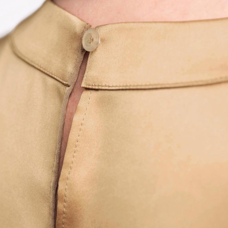 Peut-on associer cette chemise à d’autres tenues professionnelles ?Oui, sa couleur gris satiné neutre permet de l’associer facilement à des pantalons ou jupes professionnels pour un look complet.
