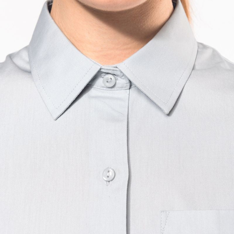 Cette chemise femme professionnelle dispose d'un col boutonné, d'une fermeture par boutons à attacher. Celle-ci possède une poche poitrine côté gauche. Sa matière : 100% coton popeline promet un entretien facile. Pour la nettoyer nous vous conseillons de la laver en machine à 40°C.