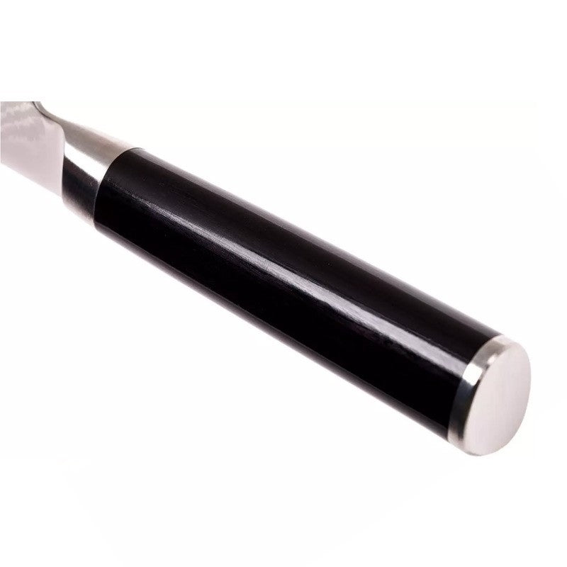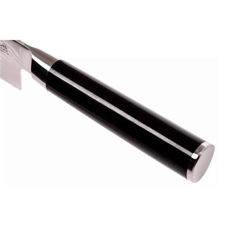 Doté d'une lame de 18 cm très tranchante grâce à son acier VGMAX, avec une composition concentrée en carbone et en cobalt, ce couteau Santoku a subi un procédé damassé 32 couches qui mélange des couches d'acier dur et mou ce qui donne de la dureté et de la flexibilité à la lame. Cela garantie un excellent tranchant tout en restant flexible pour plus de robustesse.