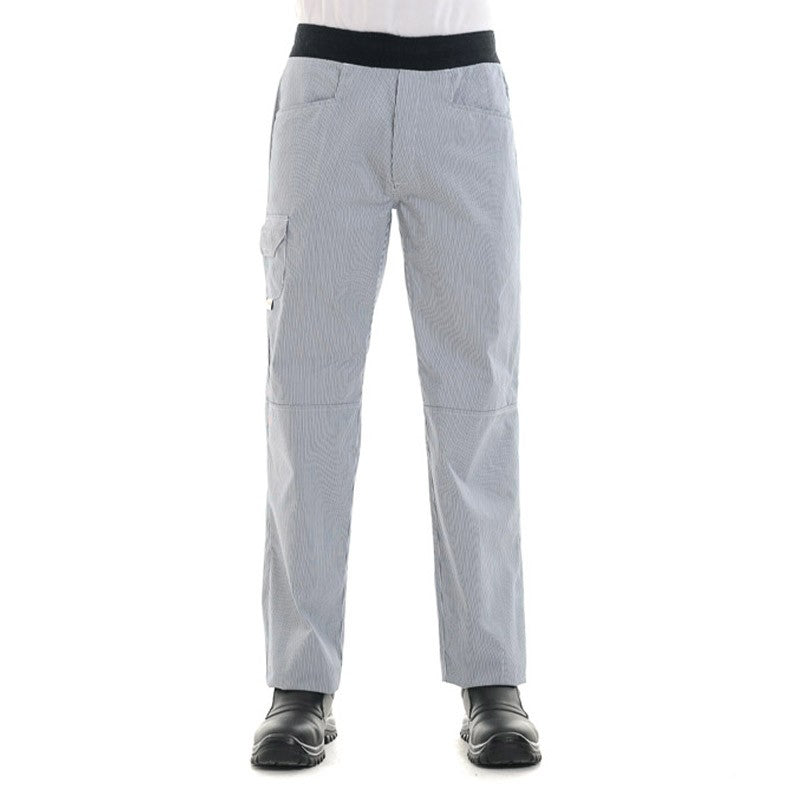 Ce pantalon ligné bleu marine change des traditionnelles tenues blanches que nous avons l'habitude de retrouver en cuisine. Doté d'un élastique à la taille, ce pantalon restera fixé même dans vos plus grands mouvements. Composé de deux poches sur les côté, vous pourrez transporter facilement tout type de bloc-notes, stylo, ou autres affaires professionnelles ou personnelles.