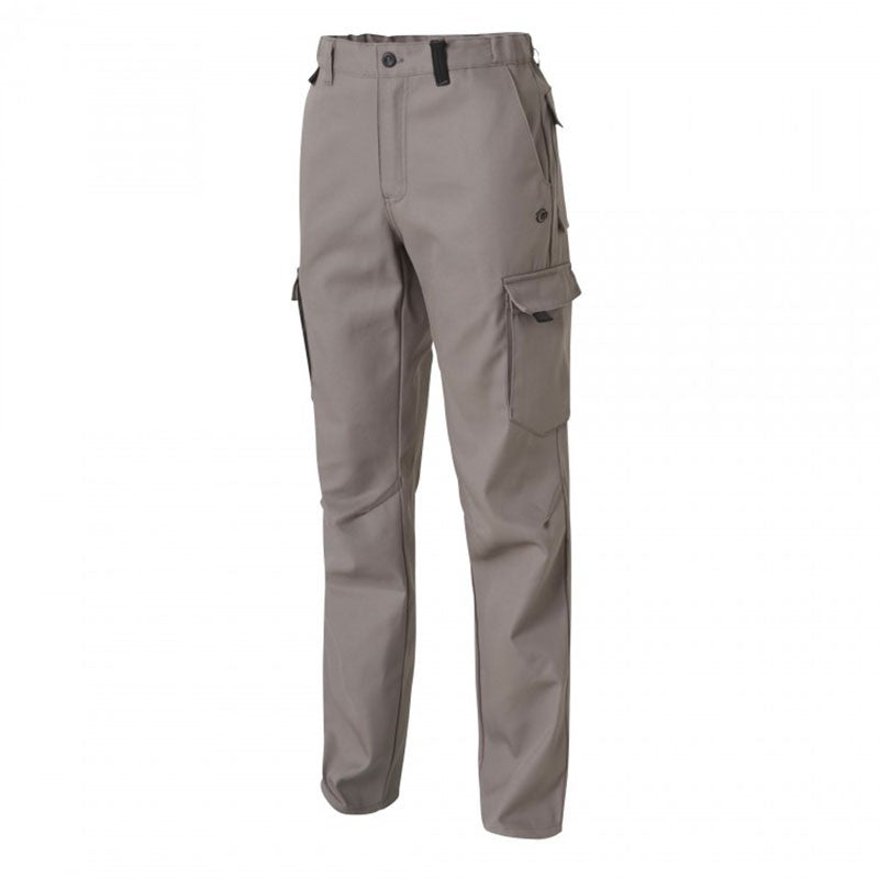 Ceinture semi-élastiquée, 5 passants dont un en ruban chevron devant gauche, 1 boucle accroche clefs à la ceinture, braguette à glissière 2 poches italiennes, 2 poches cuisses à soufflet avec rabat velcro, poche mètre intégrée dans poche cuisse droite, genoux performés, 1 poche plaquée avec rabat velcro et 1 poche téléphone à soufflet avec rabat velcro à l'arrière.