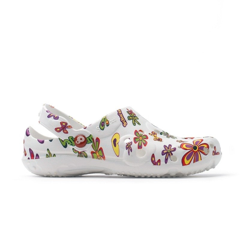 Leur motif blanc parsemé de fleurs vertes, roses et jaunes rend cette paire de sabots médicaux atypiques et originaux. Leurs semelles sont fabriquées en polymère EVA pour les rendre légers et surtout résistants. Anti-dérapants, ils sont idéals pour travailler sur les sols généralement glissants des hôpitaux.