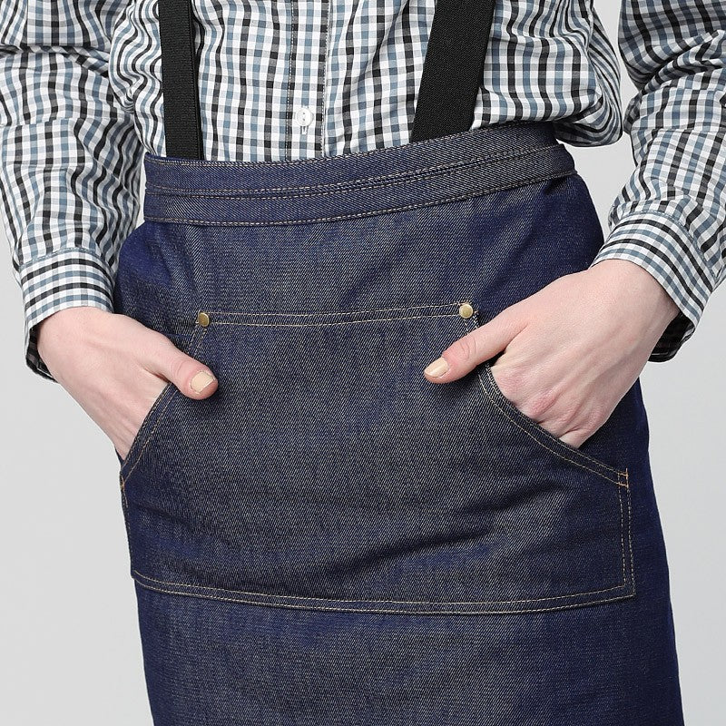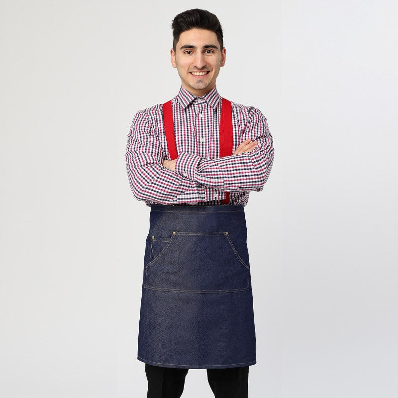 Ce tablier de service convient aussi bien aux hommes qu'aux femmes. C'est un gilet denim qu'il est possible d'attacher par l'arrière ou par le devant avec un joli nœud. Il est très facile d'accorder ce tablier avec une chemise grise ou rouge ainsi que des bretelles rouges. Cela va donner un style très prononcé et vous serez tendance dans votre travail.