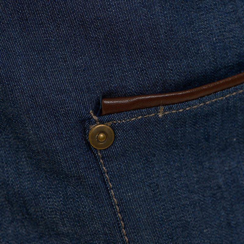Ce tablier à bavette en jean est doté d'une poche plaquée avec un liseré en simili cuir de 5 mm et des rivets vieux laiton. Le lien tour du cou est réglable et s'adapte à n'importe qui. Il est également composé d'une poche centrale, afin de pouvoir ranger votre matériel ou même votre smartphone. Pour entretenir votre tablier, il est lavable à 40 °C en machine et nécessite par forcément d'être repassé.