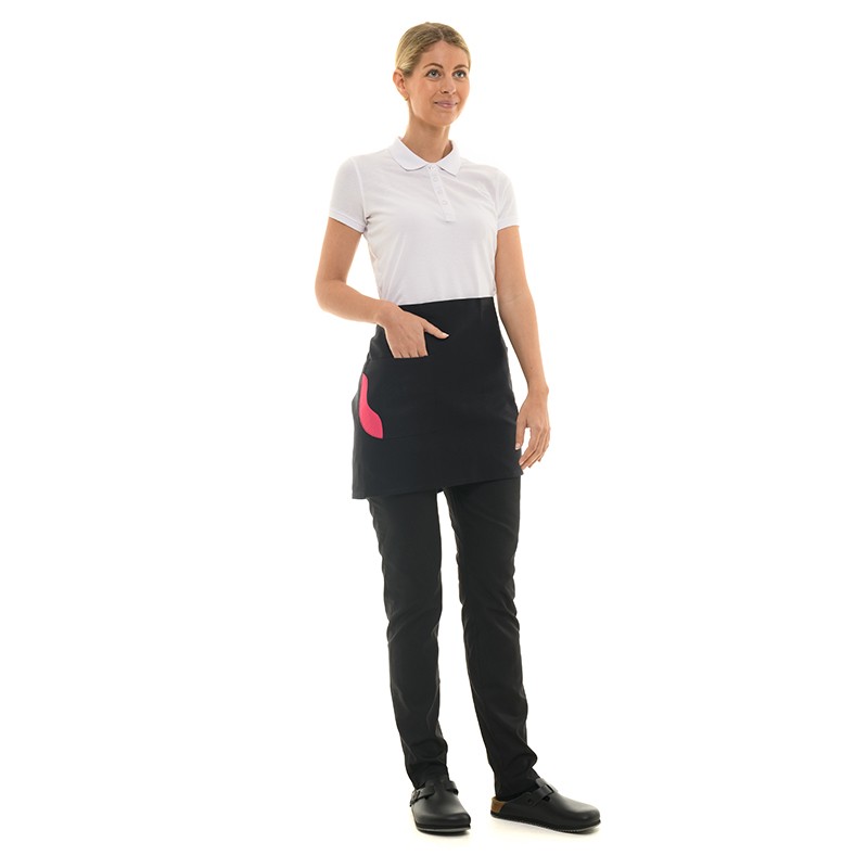 Ce tablier de serveur noir et rose fuschia est principalement utilisé par nos clients viticulteurs lors de leurs dégustations, et autres cavistes, barmans, serveurs, etc. Grâce au tablier court, il vous protégera tout au long de la journée. En version noir uni, avec sa poche à liseré en tissu rose, ce tablier professionnel est facile à nettoyer et à repasser.