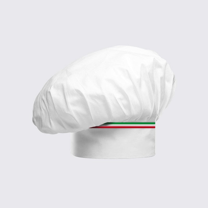 La toque est un vêtement important de la cuisine ! C'est un accessoire qui date du début de la cuisine. Pour les chefs cuisinier, les professionnels qui donnent des cours ou encore les cuisiniers de la maison, il vous faudra la toque Napoli ! Avec son petit prix, vous pourrez vous faire plaisir et en acheter plusieurs pour votre équipe. Le passepoil tricolore est parfait car il représente totalement l'Italie.