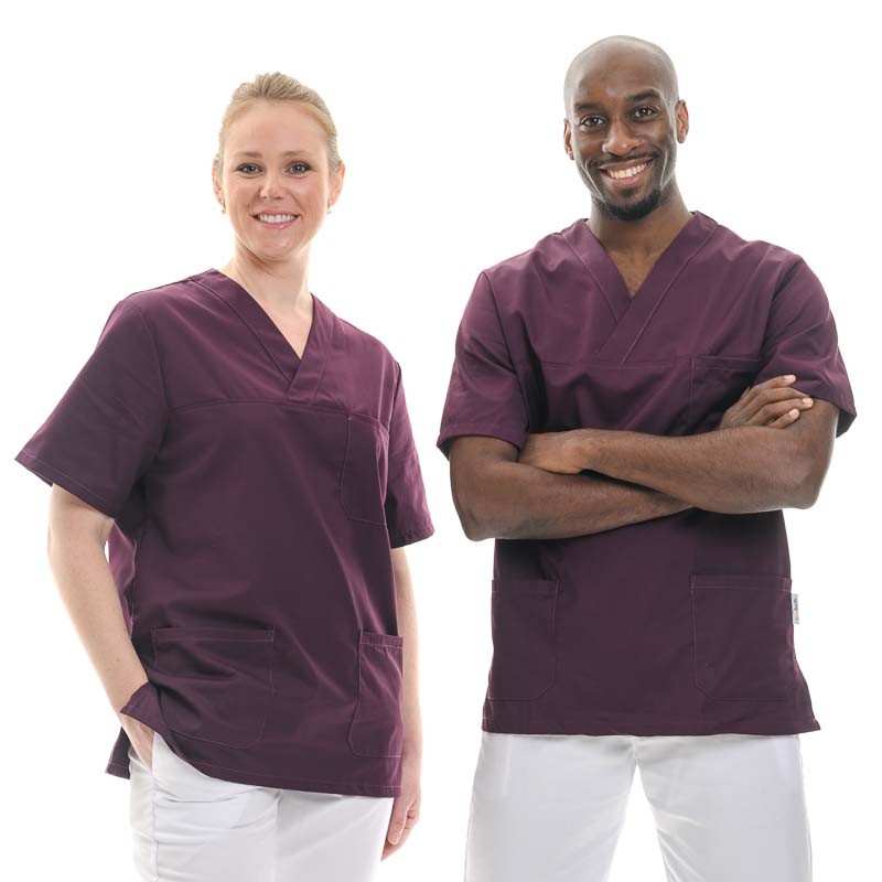 Votre tunique médicale classique se parfait d'une couleur cassis pour gagner en originalité. Couleur tendance, le cassis se marie facilement avec les exigences du secteur médical. Associé à un pantalon blanc, votre tunique gagne en luminosité.