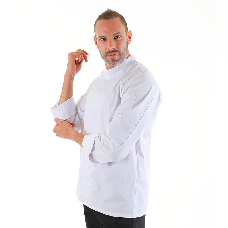 Cette veste de boulanger homme Manelli existe en manches longues ou en manches courtes. La coupe est moderne. La qualité du tissu vous séduira, car elle est réellement supérieure. Vous vous sentirez à l'aise tout au long de votre journée, car elle est très légère. L'été, elle sera parfaite en manches courtes. Pour l'hiver, les manches courtes sont adéquates, elles seront néanmoins retroussables. Elle est sobre et efficace, une veste de boulanger parfait !