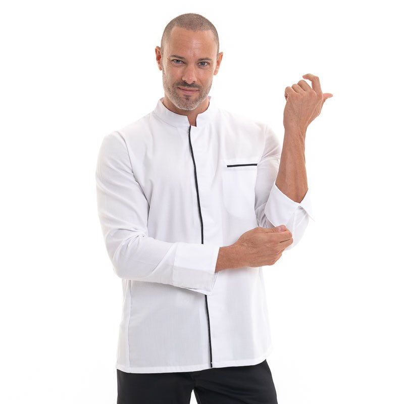 Les détails de liseré donnent une tenue supplémentaire à votre veste et vous permettent de l'associer avec classe à un pantalon de cuisine noir et des chaussures noires ou blanches.