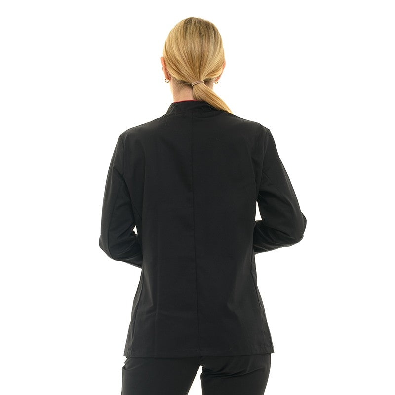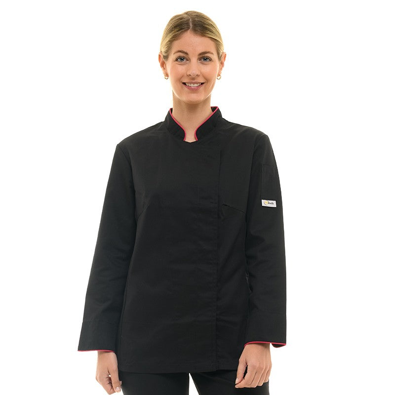Cette veste de cuisine Rosy noire à la coupe féminine et cintrée saura vous donner envie grâce à son liseré fuchsia. Un côté assez girly pour les femmes cuisinières, à ne surtout pas manquer. Ses liserés sont très fins et discrets. Composée en polycoton, elle est à la fois légère et très souple. Elle peut se laver jusqu’à 60°C en machine sans déteindre ni s’abîmer.