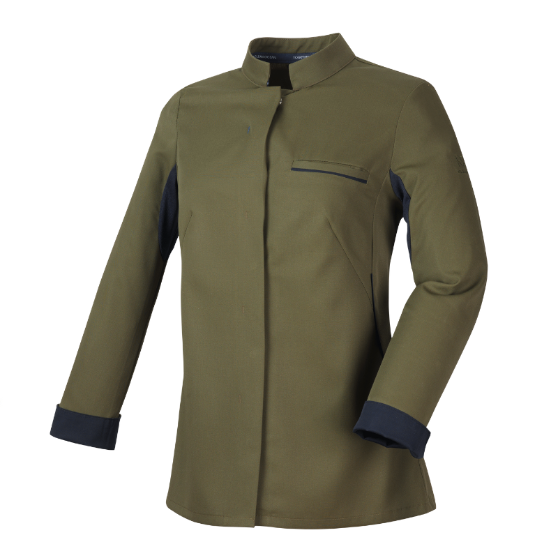 La veste de cuisine femme Escale manches longues olive Robur associe style contemporain, confort et engagement écologique. Son coloris vert olive original, rehaussé d’un liseré noir discret, apporte une touche d’élégance et de modernité à votre tenue professionnelle.
