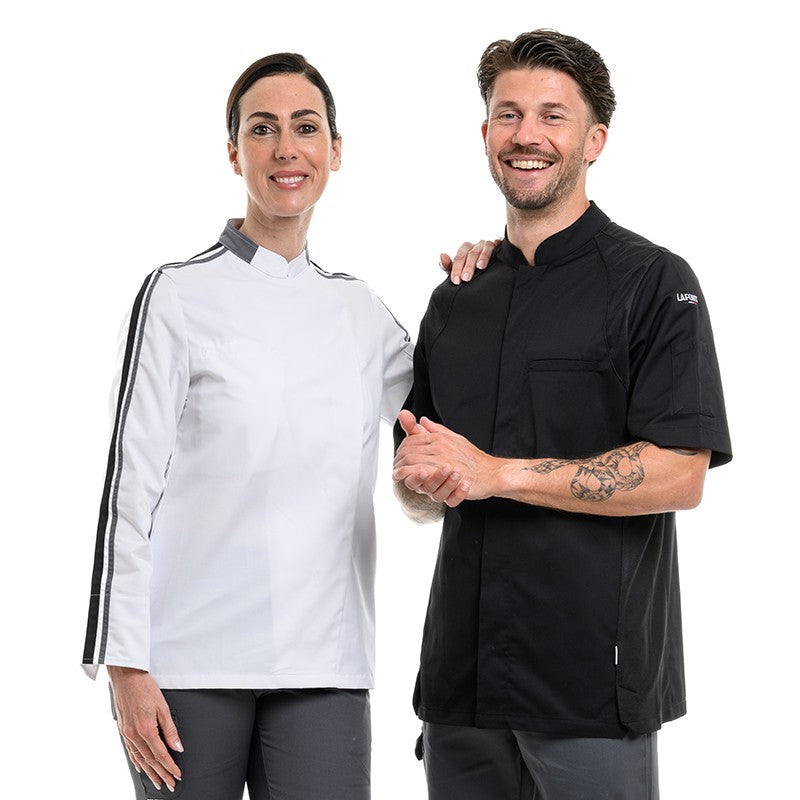 Craquez pour cette veste de cuisine pour femme avec des liserés gris et noirs ! Cette veste ajustée à la coupe des femme est parfaite pour effectuer une cuisine avec style. Ses soufflets à l'arrière du dos vous permettront de cuisiner sans avoir trop chaud.