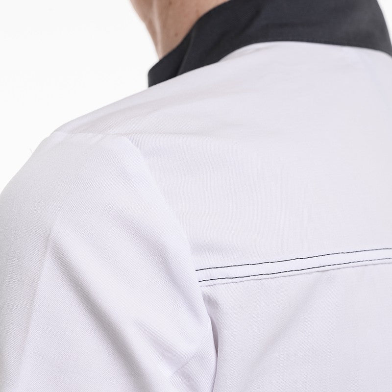 Cette veste de cuisine à manches longues blanche et grise de la marque Robur, est votre partenaire idéal. Elle est dotée de bandes en maille respirante au niveau des côtés de la veste ce qui apporte un confort immédiat et fait que les femmes se sentent bien dans leurs tenues de travail. Le confort n'est pas le seul avantage de cette veste, elle est ajustée au niveau de la taille et permet aux femmes d'être élégante et d'avoir une veste qui épouse parfaitement leurs formes. Elle se ferme avec des boutons-pression ce qui la rend facile à mettre et à retirer, la qualité ne se perdra pas au fil des lavages, elle peut être lavée à 75°C en machine et ôter les taches même les plus tenaces.