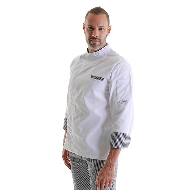 Nous vous proposons cette veste de Cuisine Originale avec des motifs à carreaux, manches longues en blanc contraste. Motif pied de poule, cette veste est idéal pour les cuisiniers ou encore les métiers de boulanger & pâtissier.