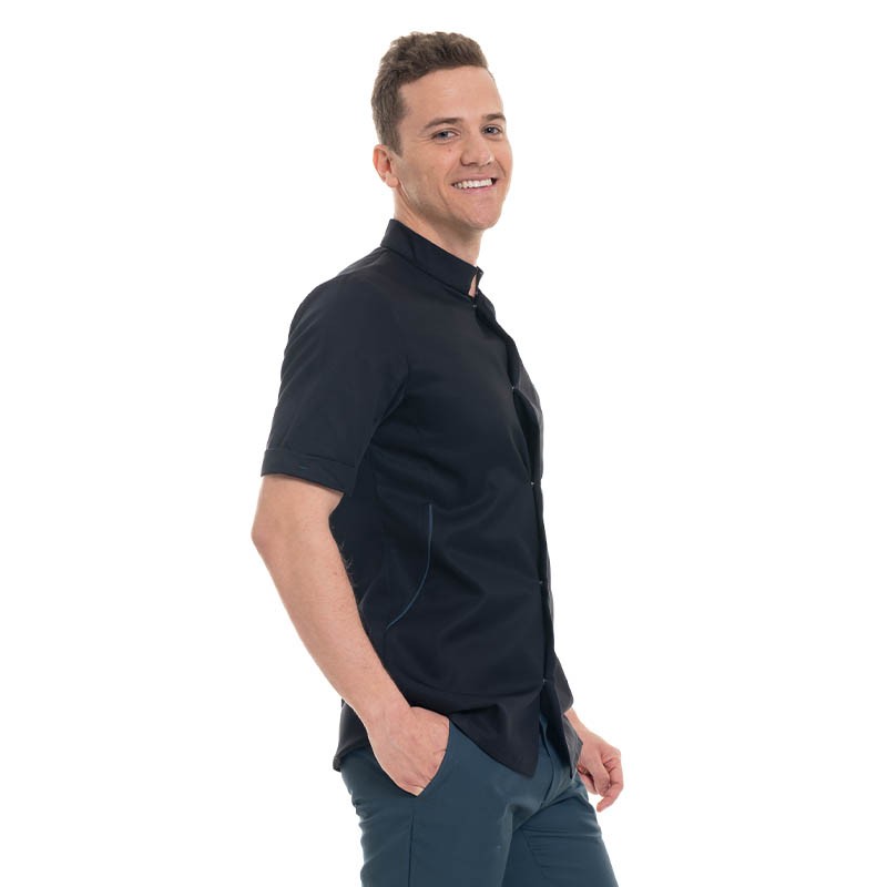 Exigez la qualité en cuisine avec cette veste de cuisine mixte noir au liseré bleu océan, entre classe et confort.