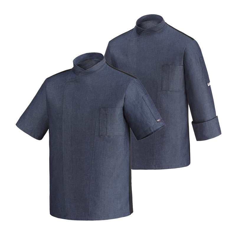 La veste de pâtissier Ottavio à manches longues en jeans est un modèle original de la marque Egochef .Un modèle qui casse les codes traditionnels de la veste blanche ou noire de pâtissier. Un modèle moderne, qui s'adapte notamment aux cuisines rapides et aux food truck.